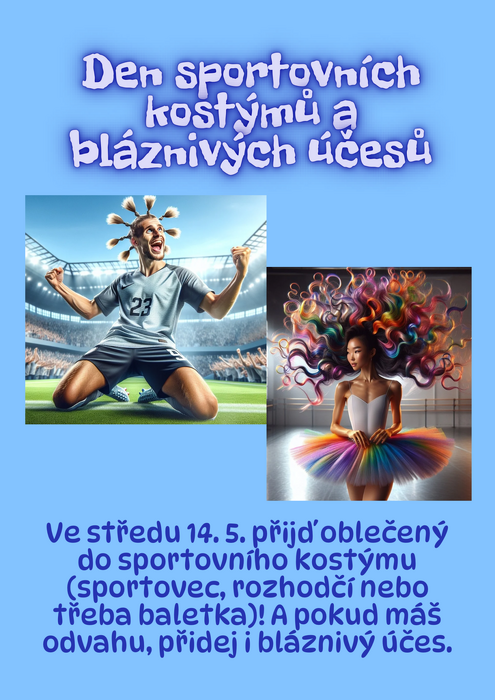 Ve středu 14. května proběhl na naší škole veselý a netradiční den plný barev a nápaditostí. Školní chodby zaplnily děti v nejrůznějších sportovních kostýmech-od fotbalistů přes gymnastky až po potápěče a nechyběla ani spousta opravdu kreativních účesů. Na to, jak se to dětem povedlo, se podívejte ve fotogalerii.
