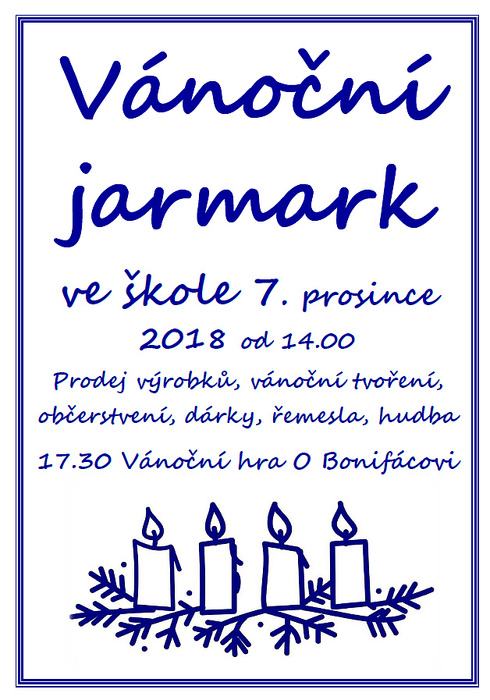 Na vánoční jarmark navazuje Vánoční hra o Bonifácovi, kterou si připravili naši žáci pod vedením pana učitele Josefa Jakubkoviče. A tak všichni zažijeme tu nezapomenutelnou pravou vánoční atmosféru. Na závěr zazpívají žáci 3.třídy.