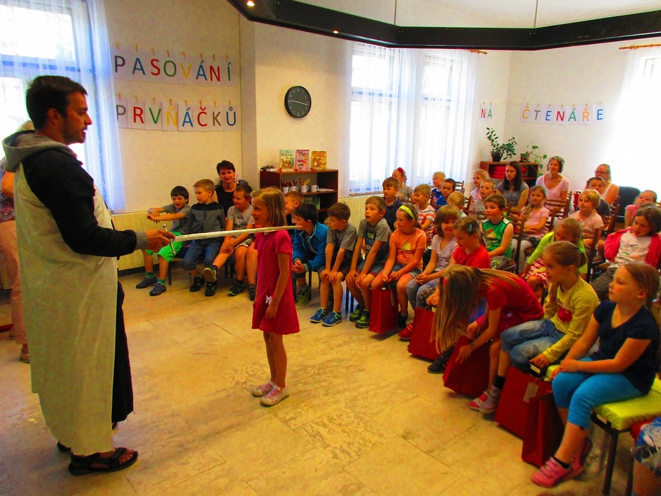 V pondělí 29. května nás pozvala p. Pekárková, knihovnice městyse Nový Hrozenkov na slavnostní pasování prvňáčků na čtenáře. Dalšími hosty byli i předškoláci z mateřské školky. Všichni byli svědky slavnosti pasování rytířem a královnou. Mladí čtenáři dostali nejen hezké dárky, ale darem jim bylo i divadélko, které následovalo.