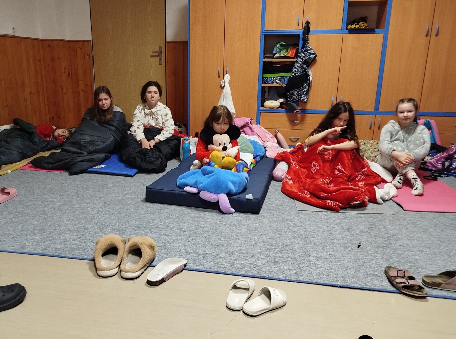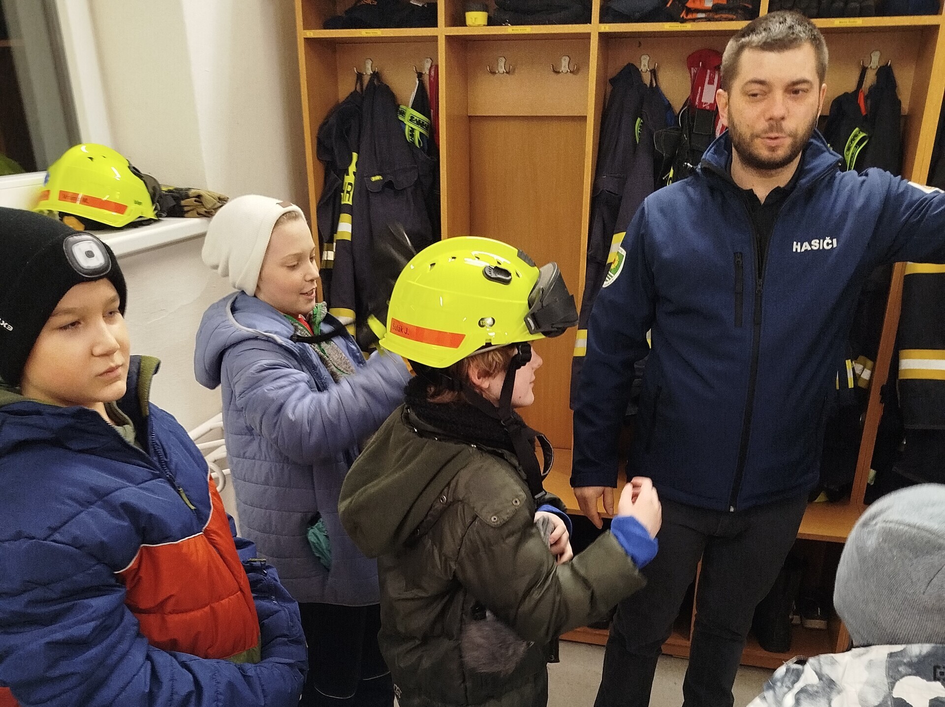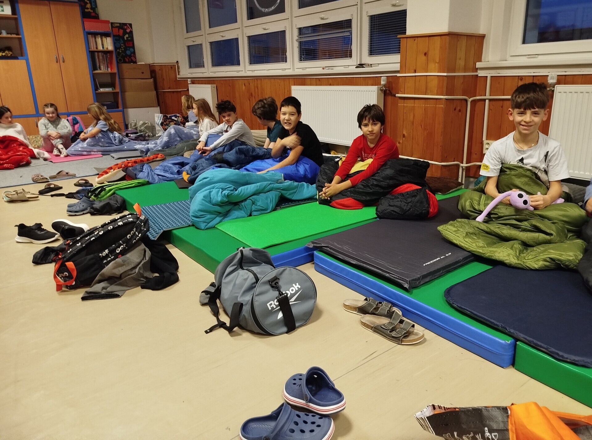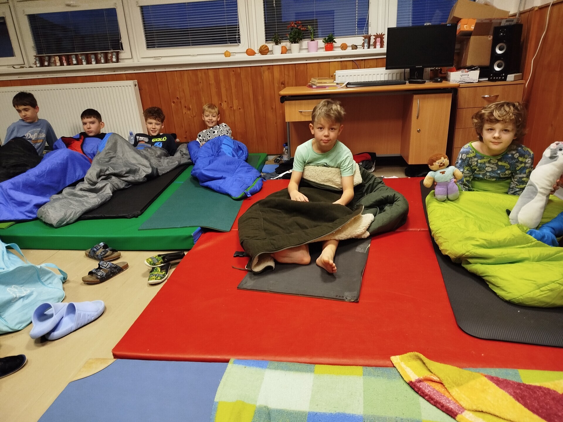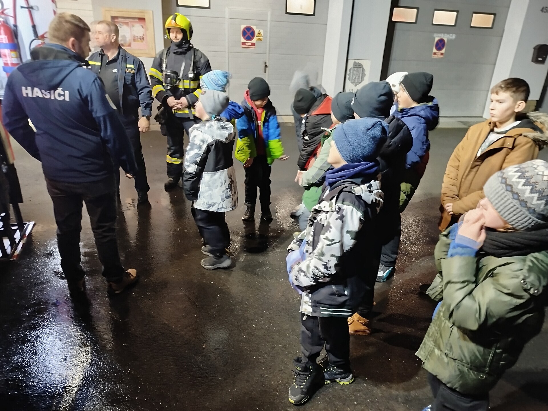 Přenocovali jsme ve škole. Předtím jsme večer navštívili místní hasiče. Chlapi se nám úžasně věnovali. Vytáhli nám ven auto za spoustu miliónů a předvedli, jaké vybavení má. Nejvíc se všem líbilo naskákat na chvíli dovnitř. V hasičárně probíhala lekce zdravovědy. Děti si vyzkoušely, že taková masáž srdce není vůbec jednoduchá. A noc samotná? No krátká, jak jinak. Však se doma potom všichni doodpočívali...