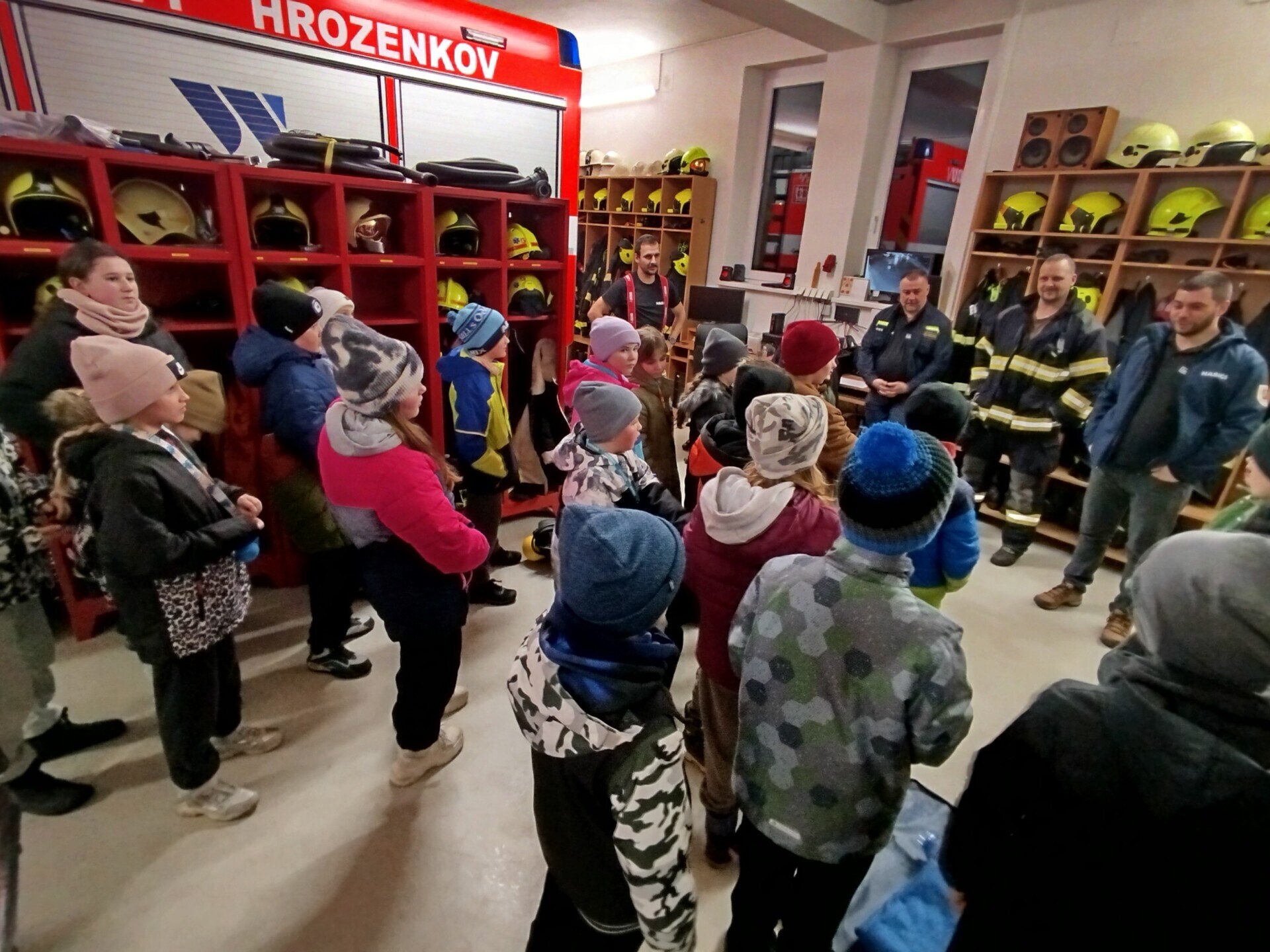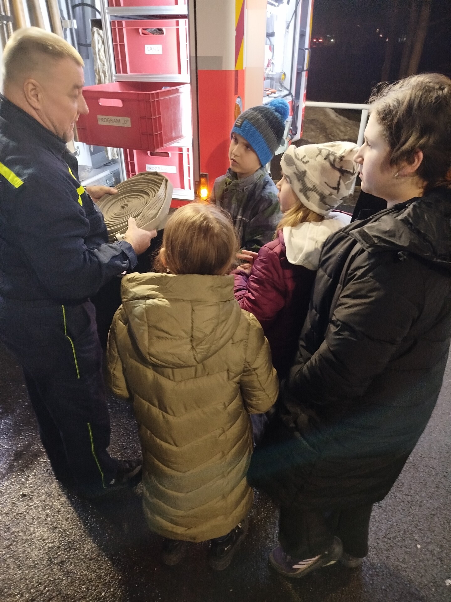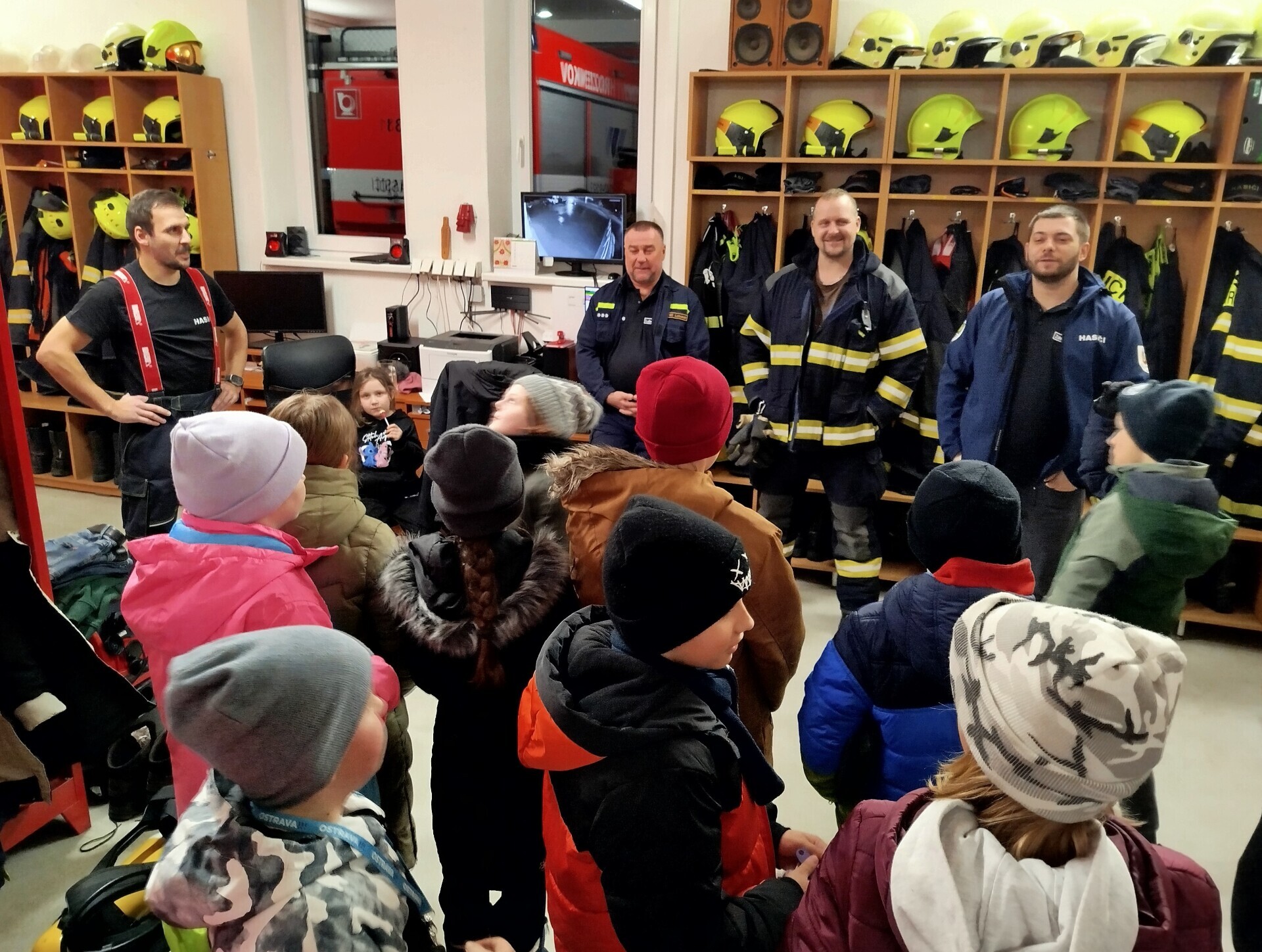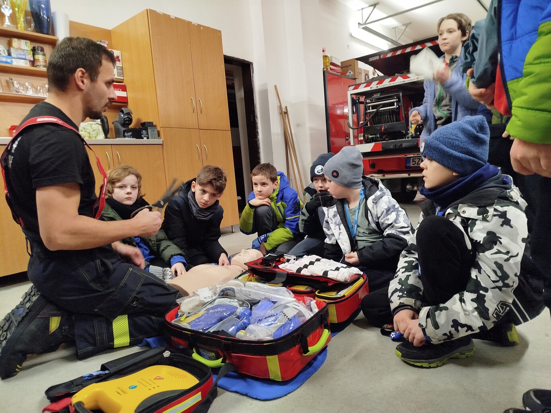 Přenocovali jsme ve škole. Předtím jsme večer navštívili místní hasiče. Chlapi se nám úžasně věnovali. Vytáhli nám ven auto za spoustu miliónů a předvedli, jaké vybavení má. Nejvíc se všem líbilo naskákat na chvíli dovnitř. V hasičárně probíhala lekce zdravovědy. Děti si vyzkoušely, že taková masáž srdce není vůbec jednoduchá. A noc samotná? No krátká, jak jinak. Však se doma potom všichni doodpočívali...