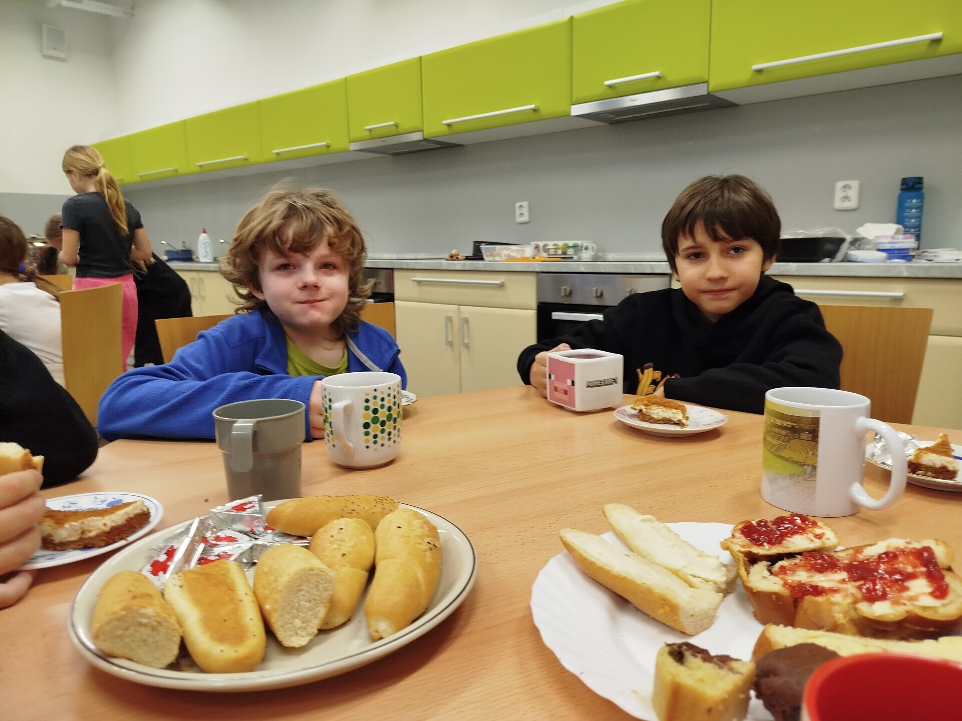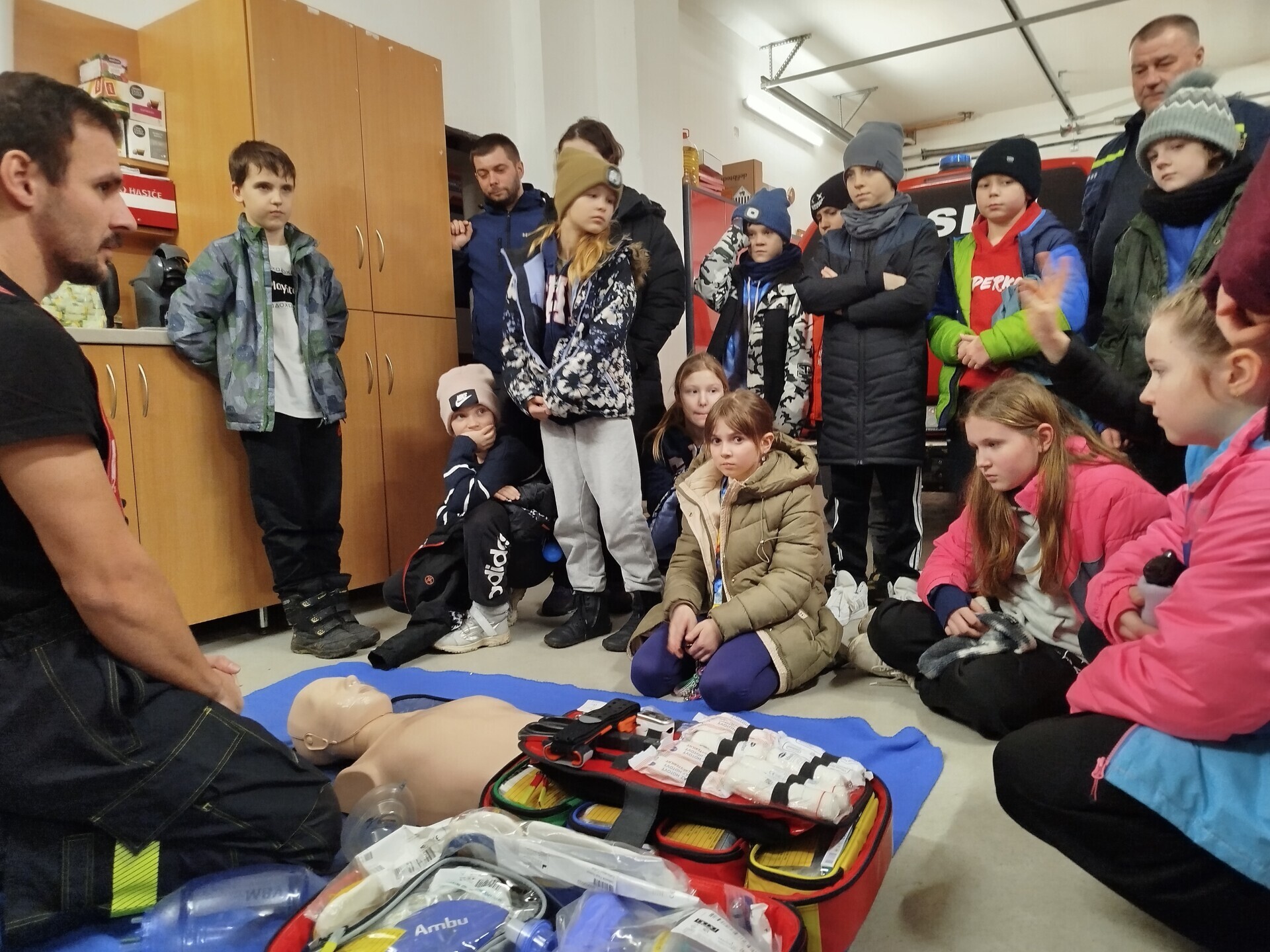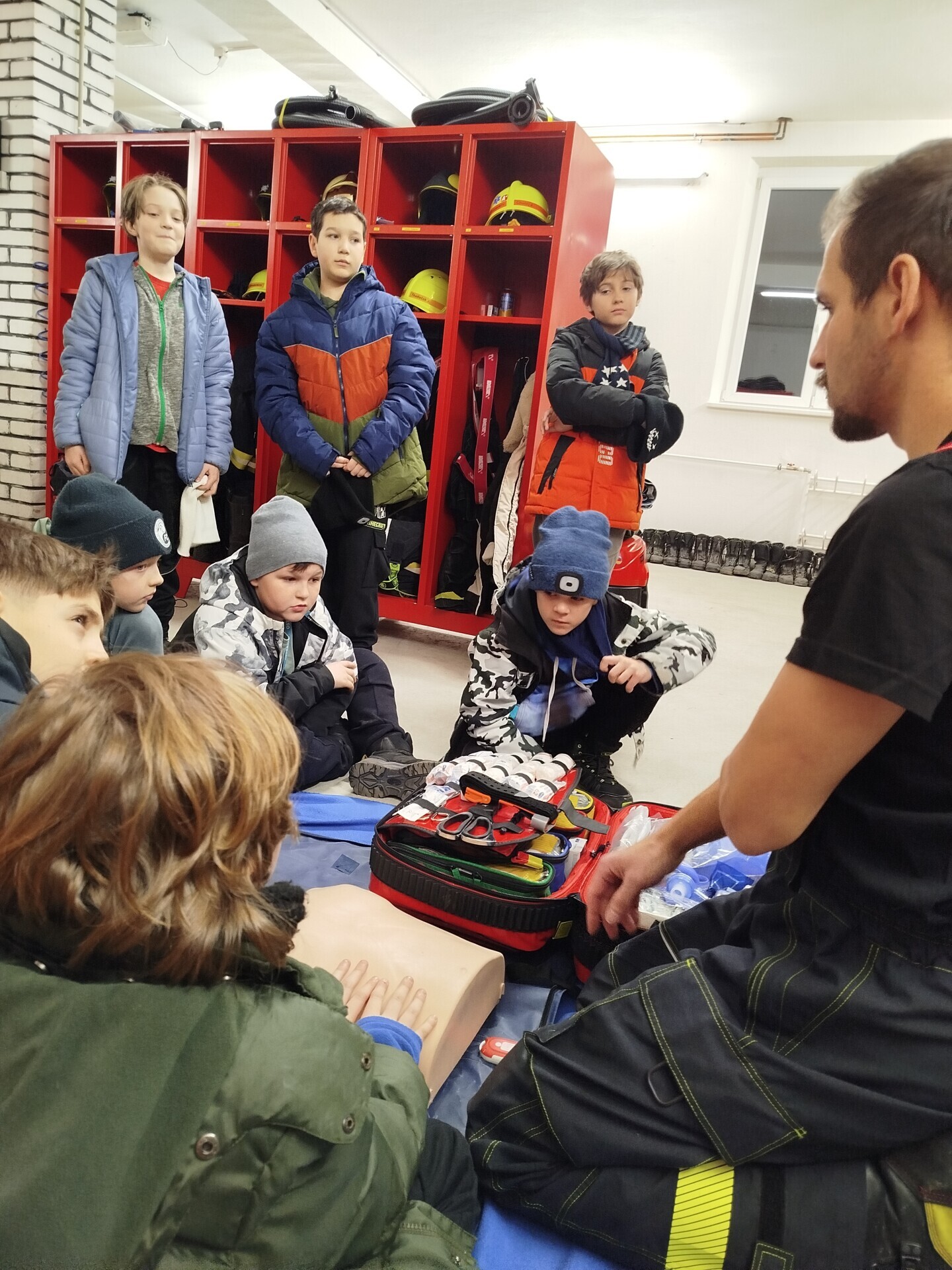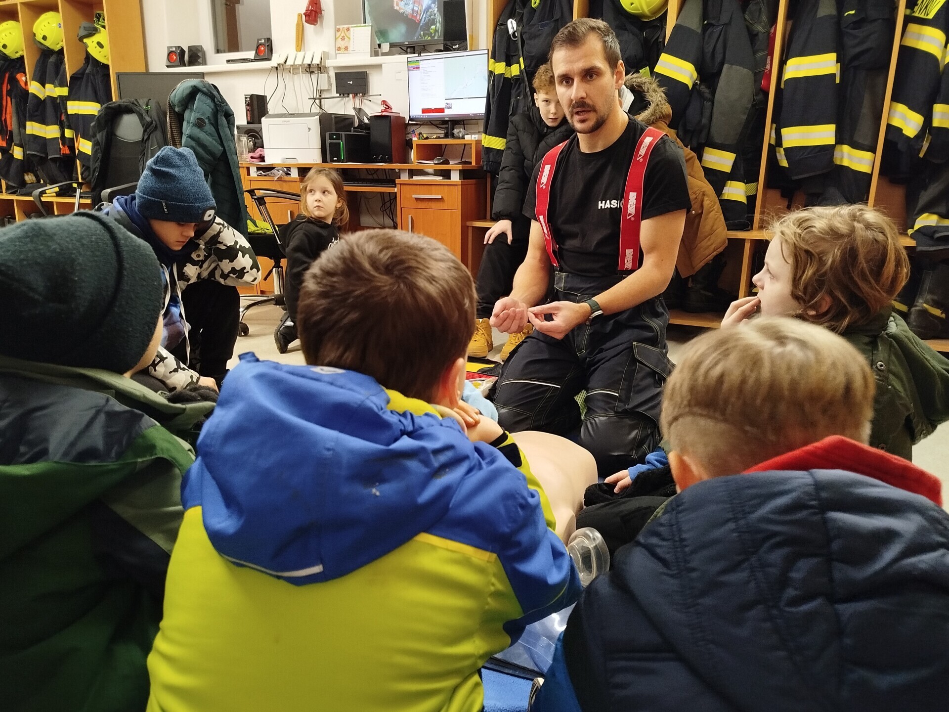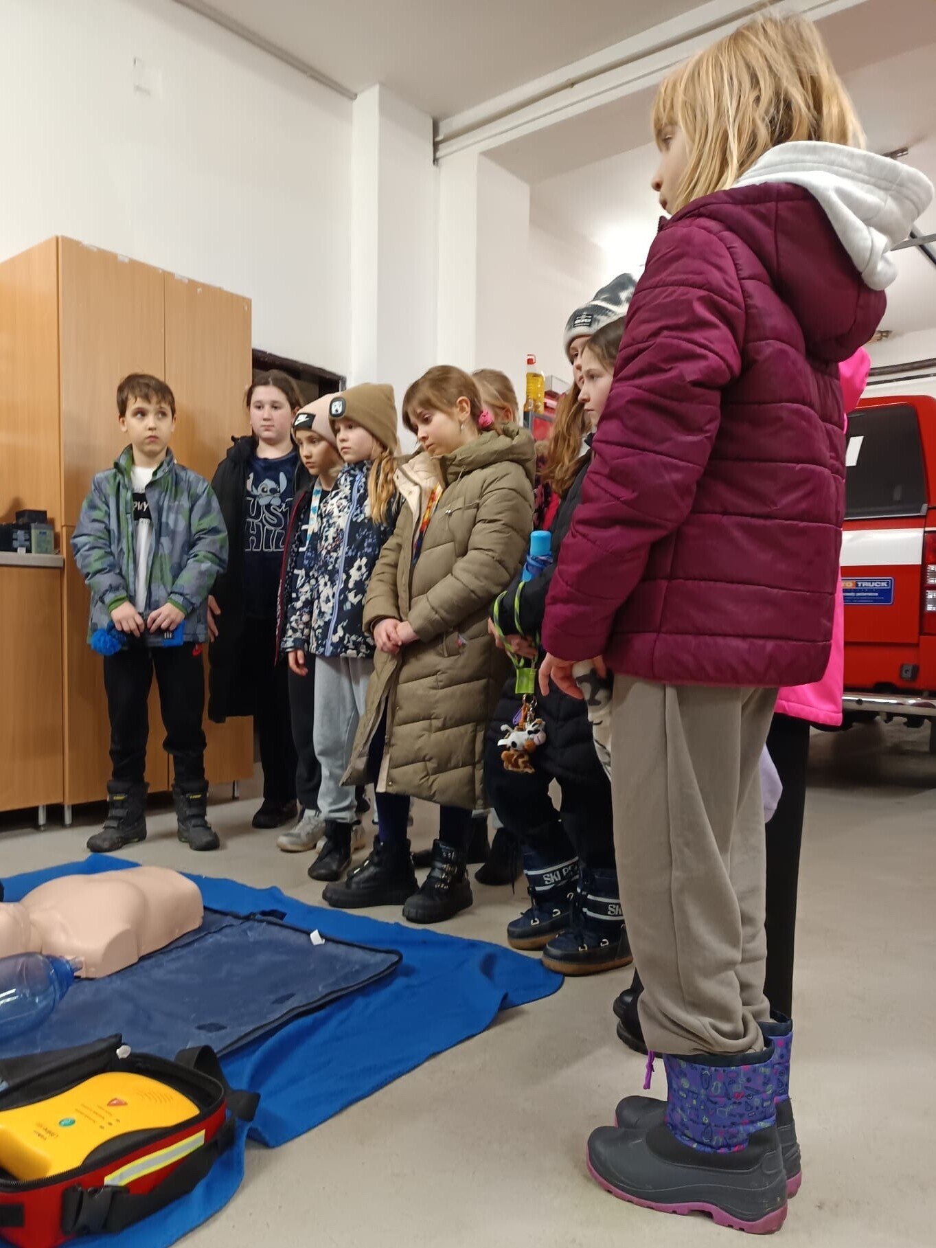 Přenocovali jsme ve škole. Předtím jsme večer navštívili místní hasiče. Chlapi se nám úžasně věnovali. Vytáhli nám ven auto za spoustu miliónů a předvedli, jaké vybavení má. Nejvíc se všem líbilo naskákat na chvíli dovnitř. V hasičárně probíhala lekce zdravovědy. Děti si vyzkoušely, že taková masáž srdce není vůbec jednoduchá. A noc samotná? No krátká, jak jinak. Však se doma potom všichni doodpočívali...
