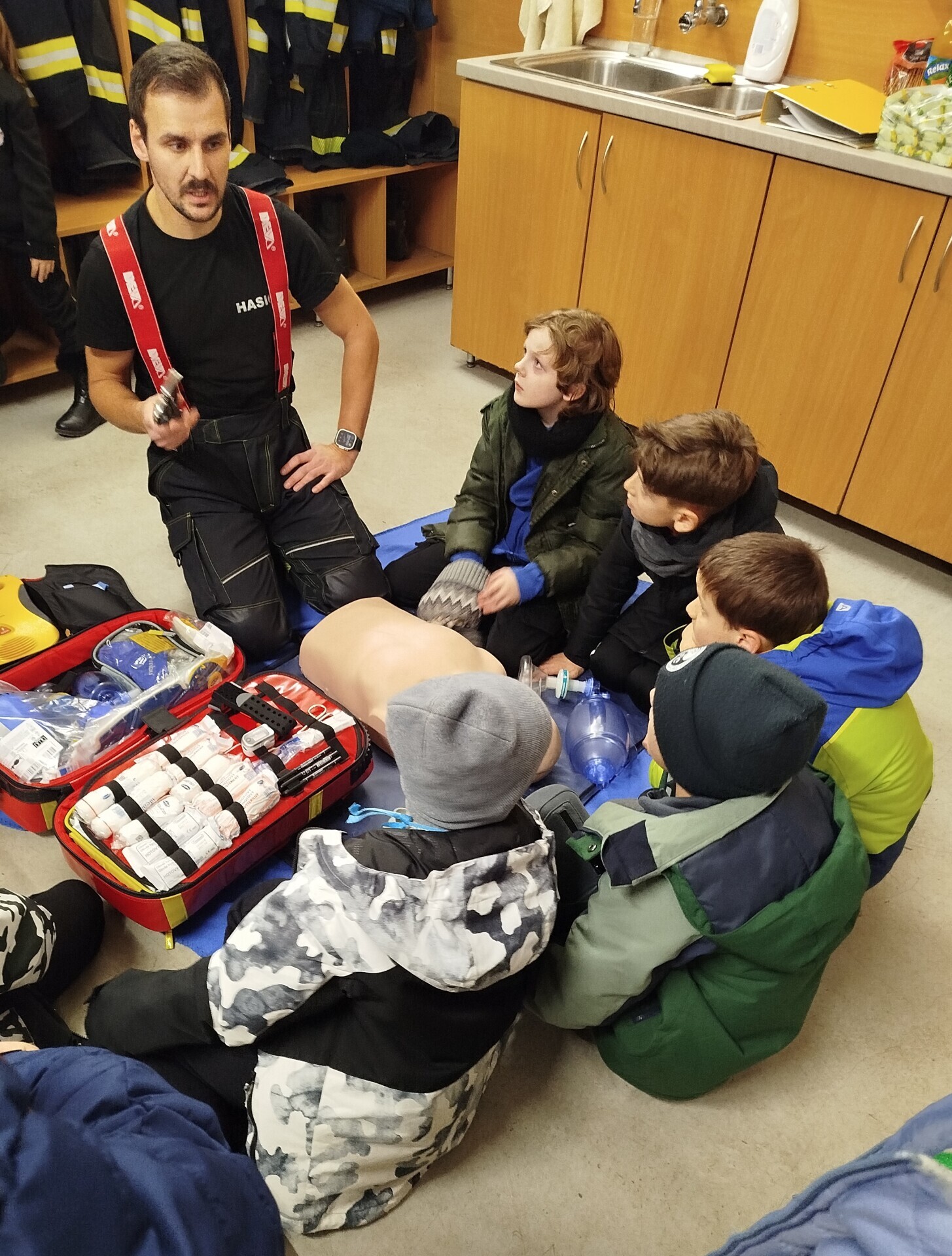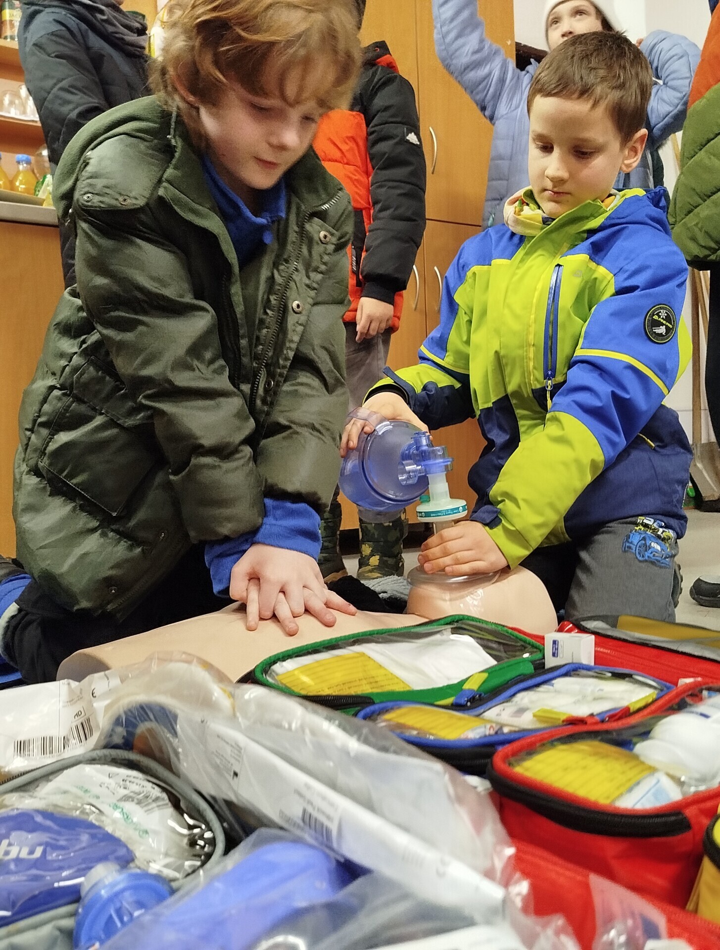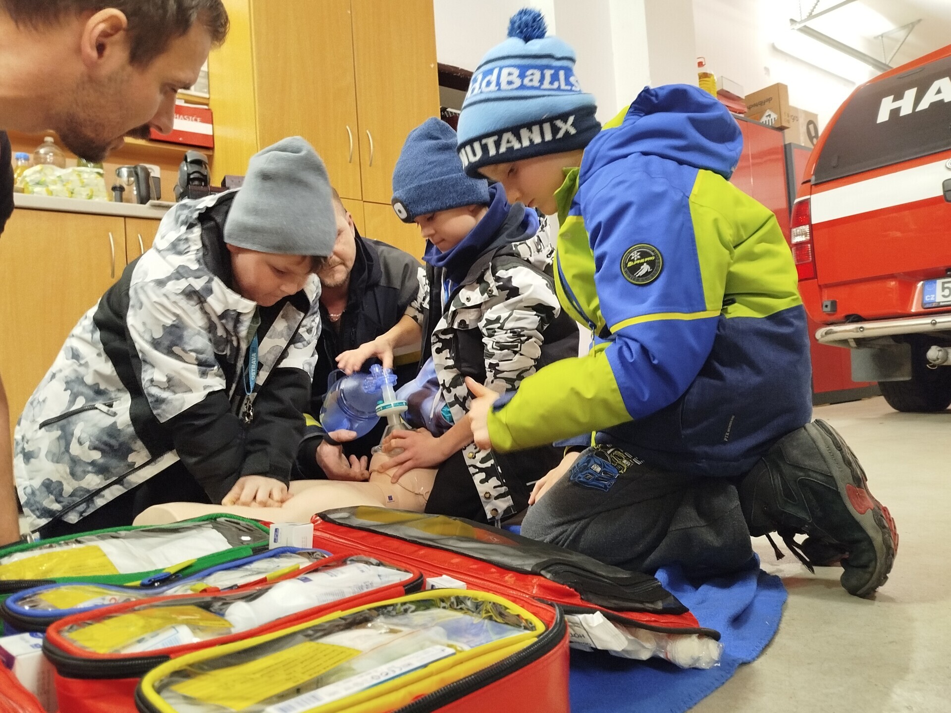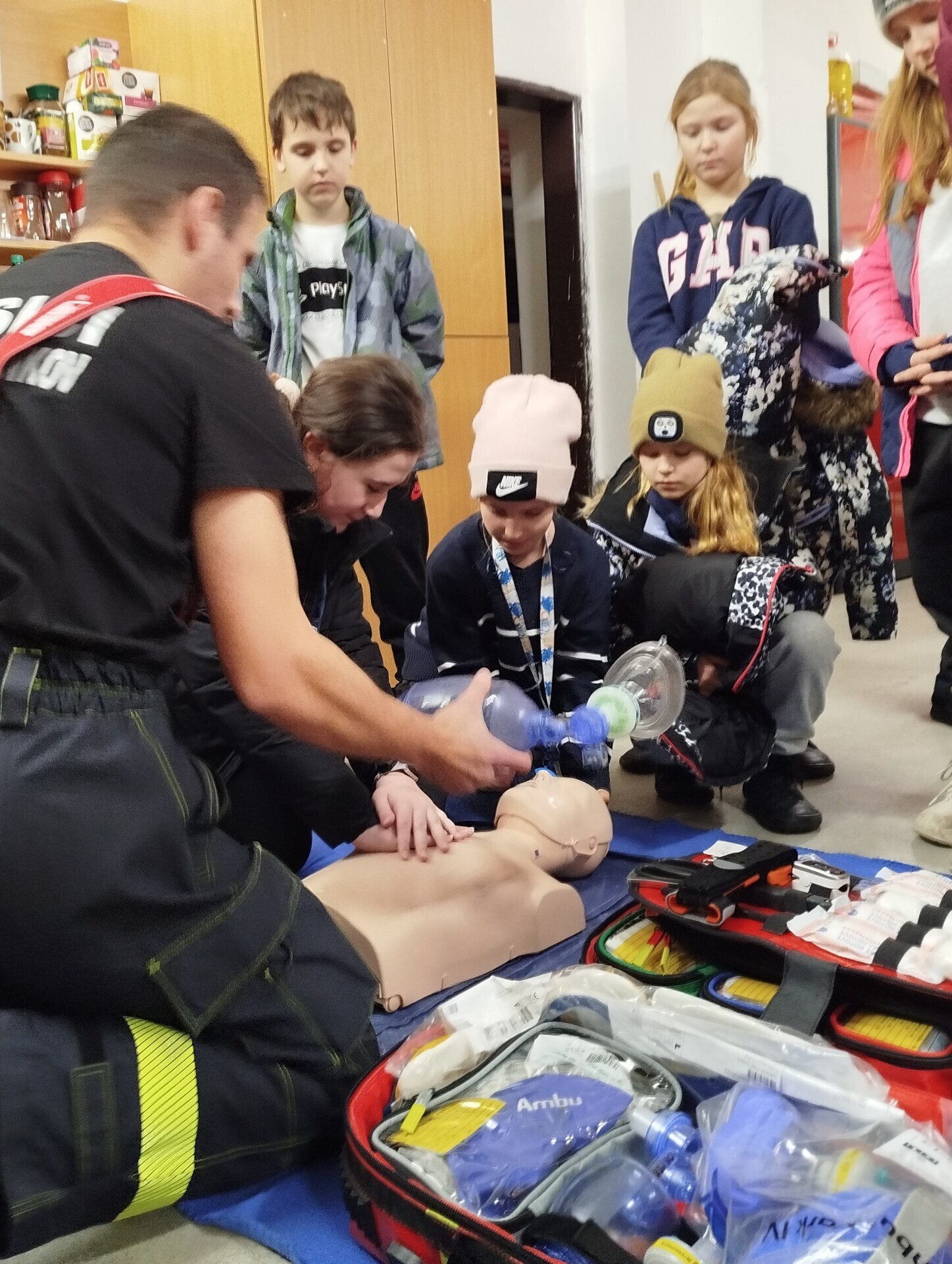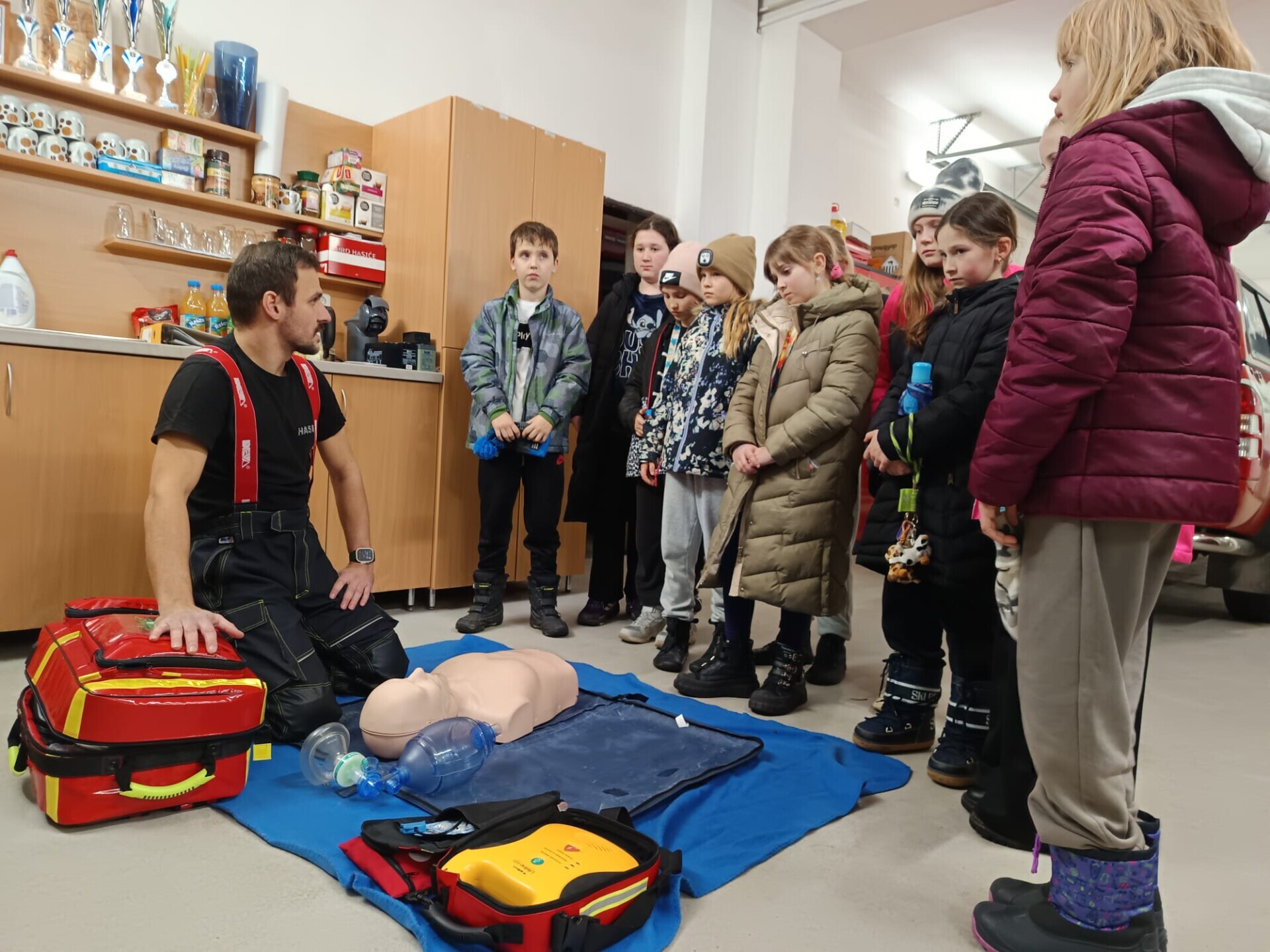 Přenocovali jsme ve škole. Předtím jsme večer navštívili místní hasiče. Chlapi se nám úžasně věnovali. Vytáhli nám ven auto za spoustu miliónů a předvedli, jaké vybavení má. Nejvíc se všem líbilo naskákat na chvíli dovnitř. V hasičárně probíhala lekce zdravovědy. Děti si vyzkoušely, že taková masáž srdce není vůbec jednoduchá. A noc samotná? No krátká, jak jinak. Však se doma potom všichni doodpočívali...