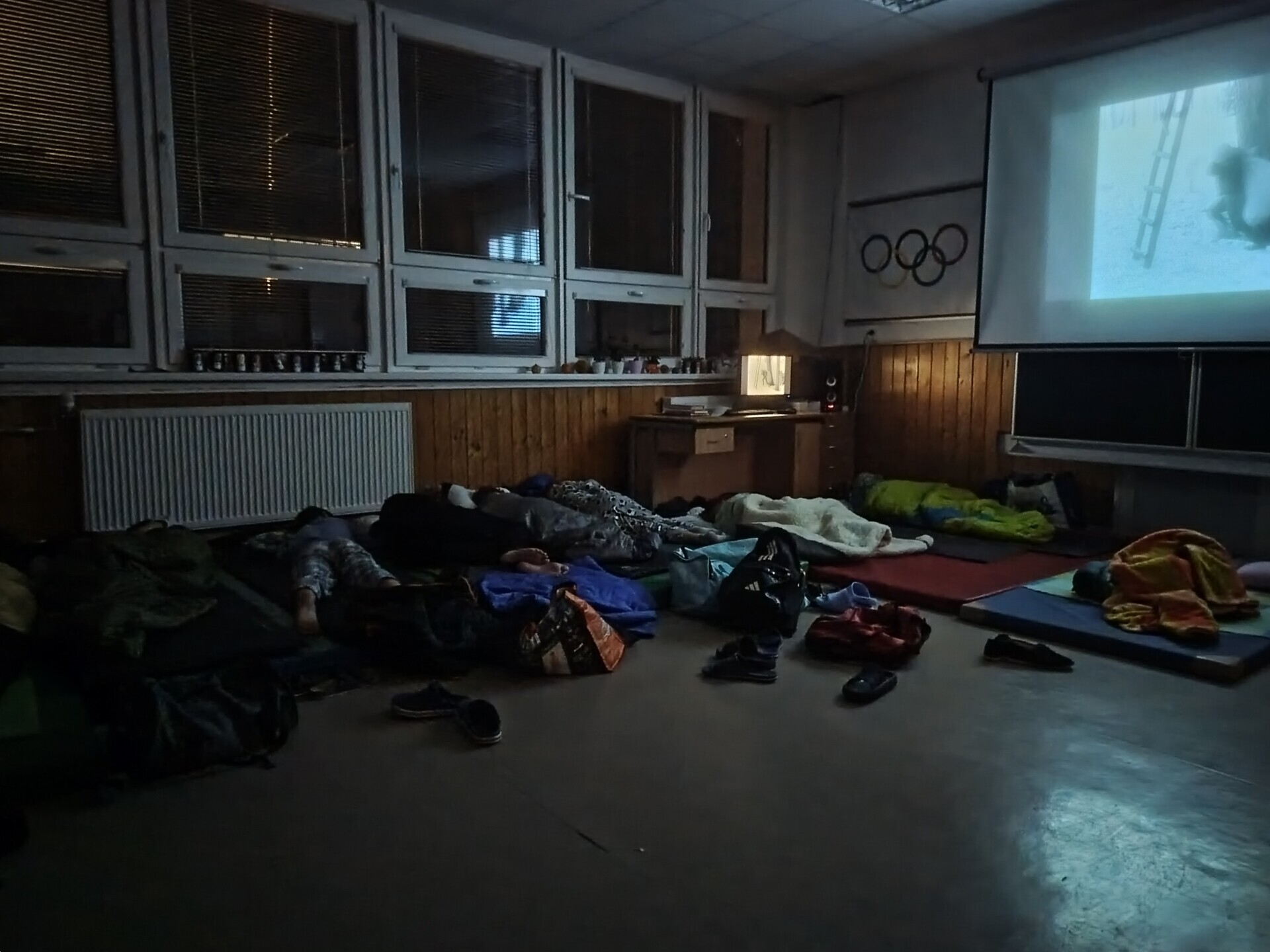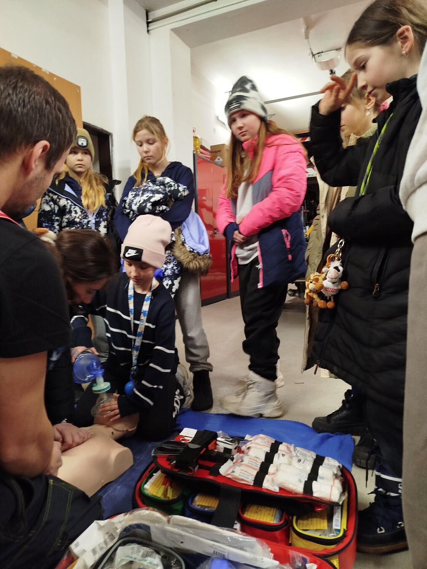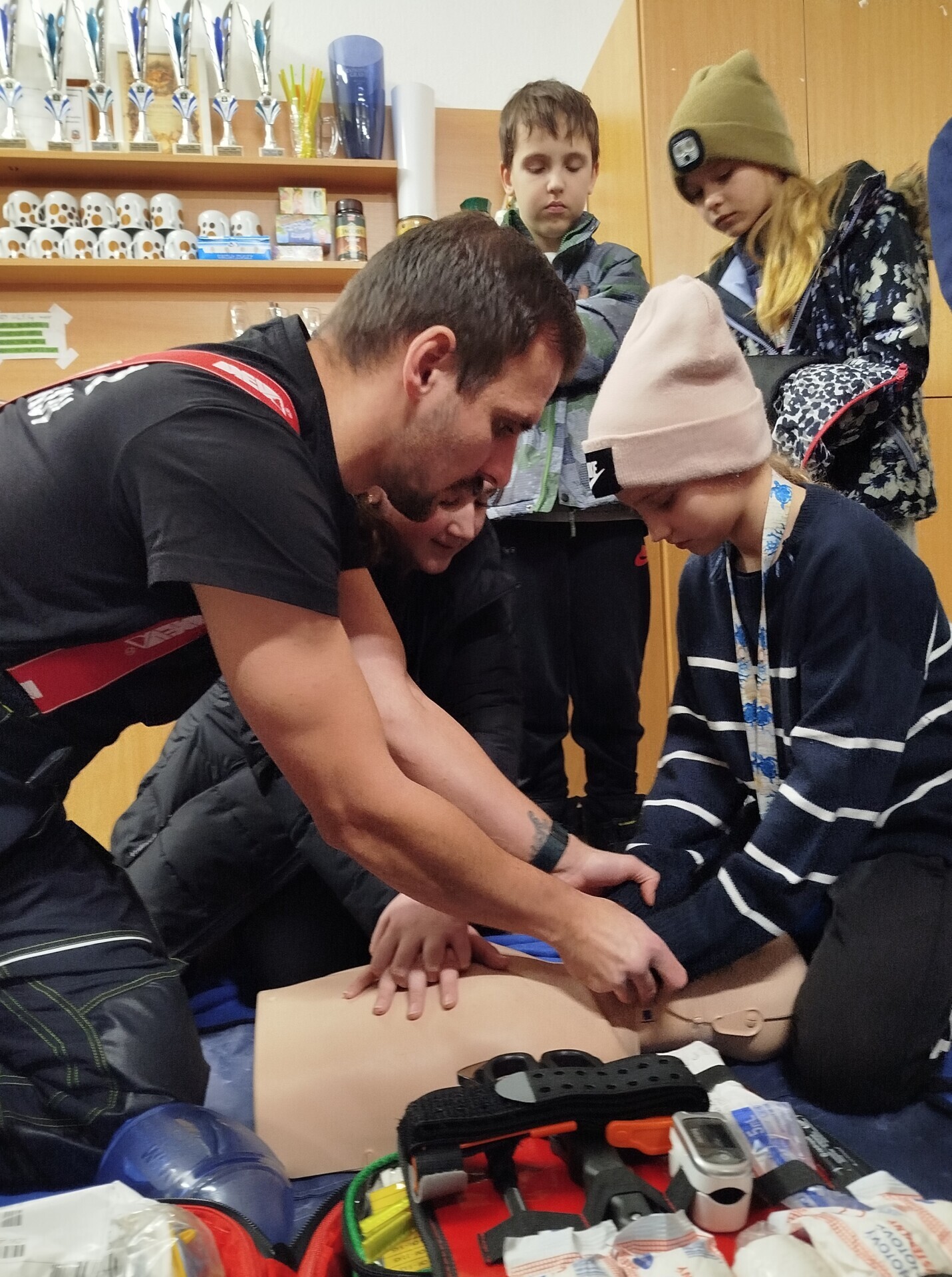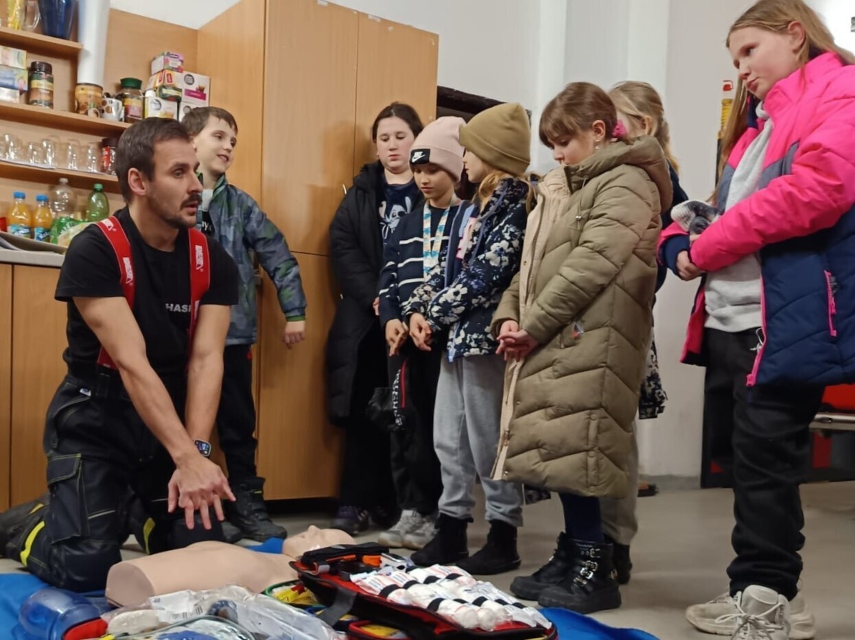 Přenocovali jsme ve škole. Předtím jsme večer navštívili místní hasiče. Chlapi se nám úžasně věnovali. Vytáhli nám ven auto za spoustu miliónů a předvedli, jaké vybavení má. Nejvíc se všem líbilo naskákat na chvíli dovnitř. V hasičárně probíhala lekce zdravovědy. Děti si vyzkoušely, že taková masáž srdce není vůbec jednoduchá. A noc samotná? No krátká, jak jinak. Však se doma potom všichni doodpočívali...