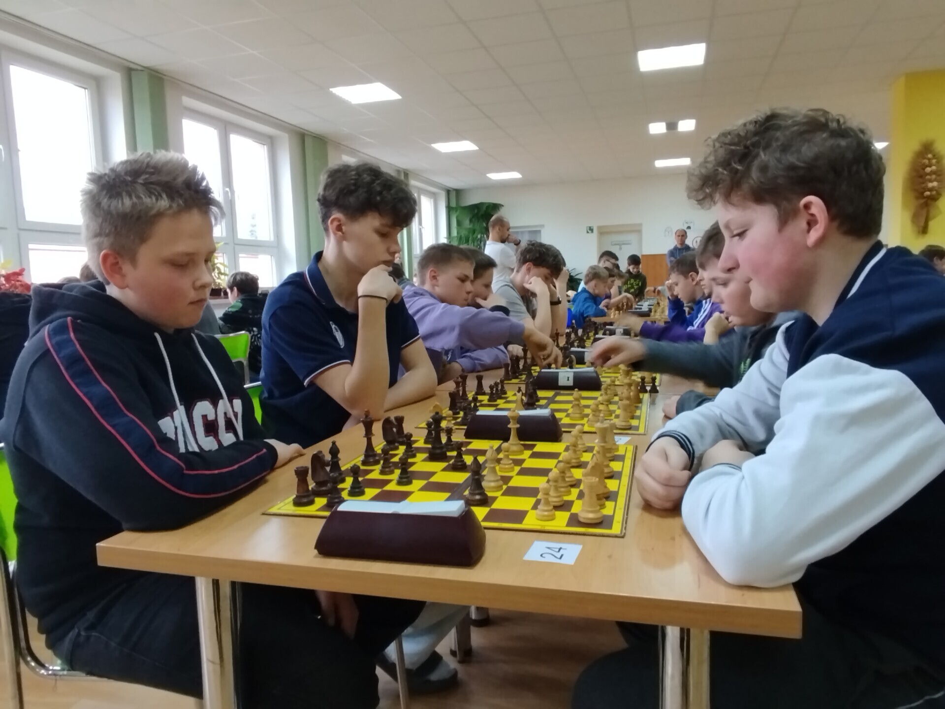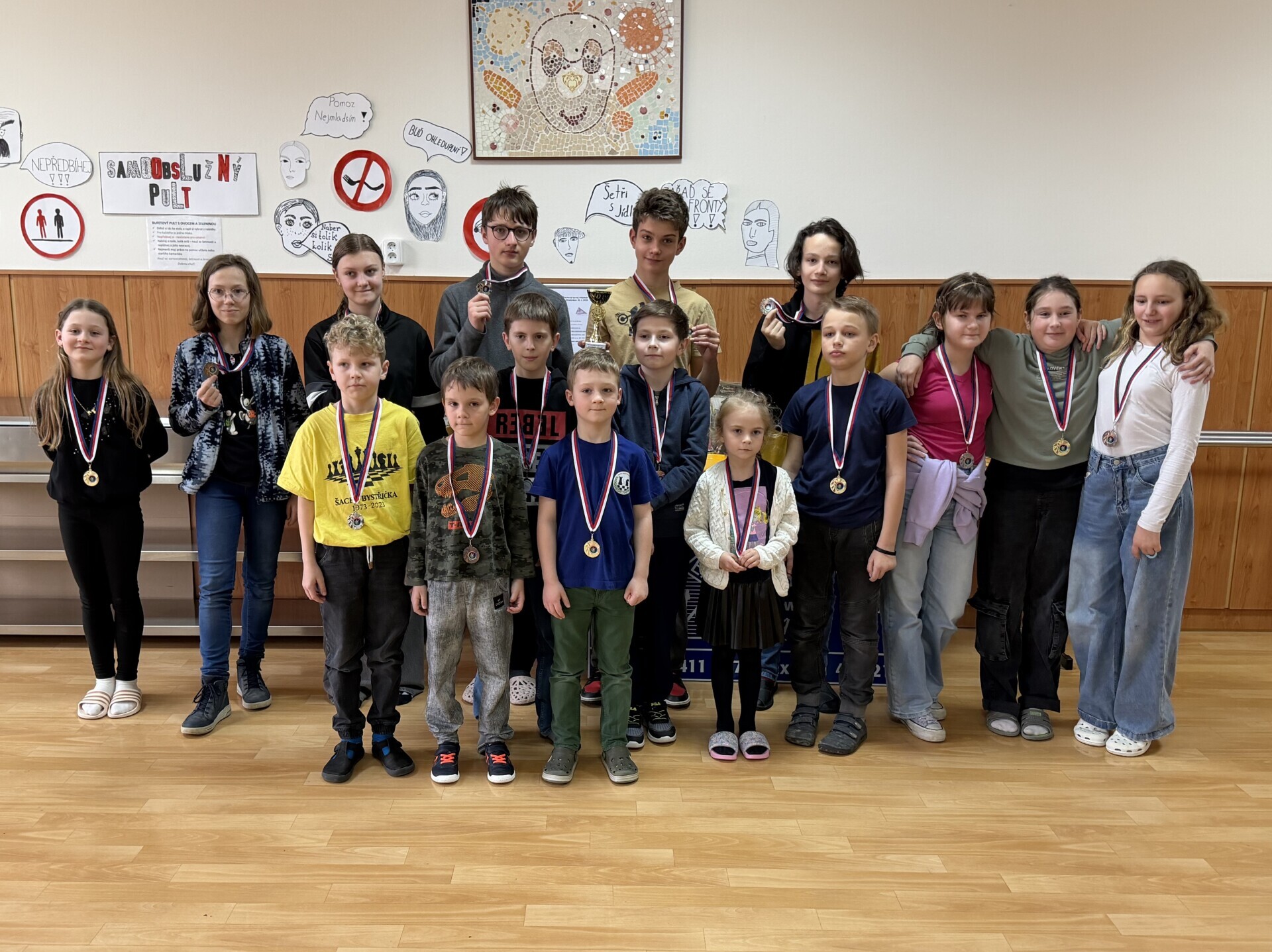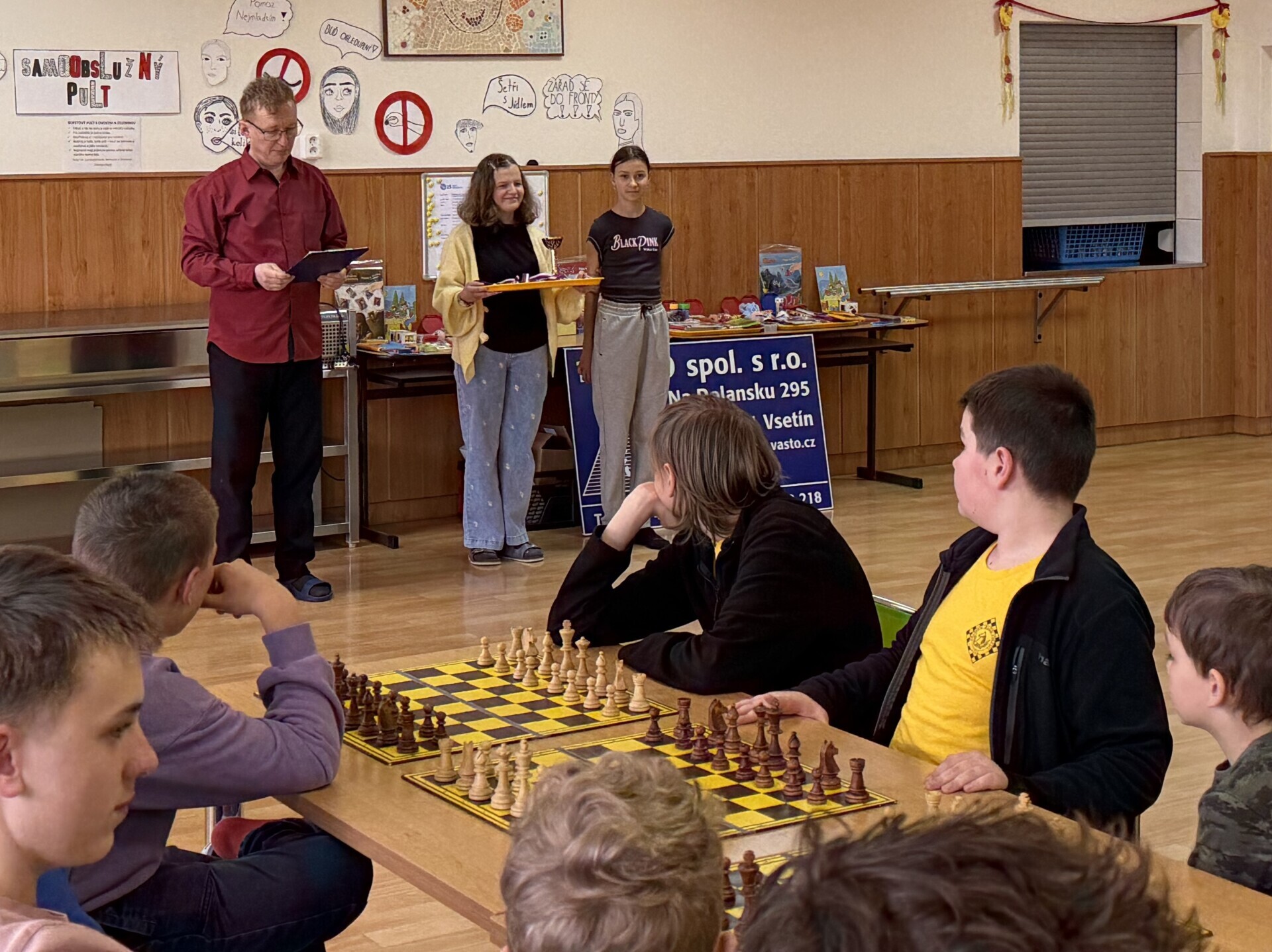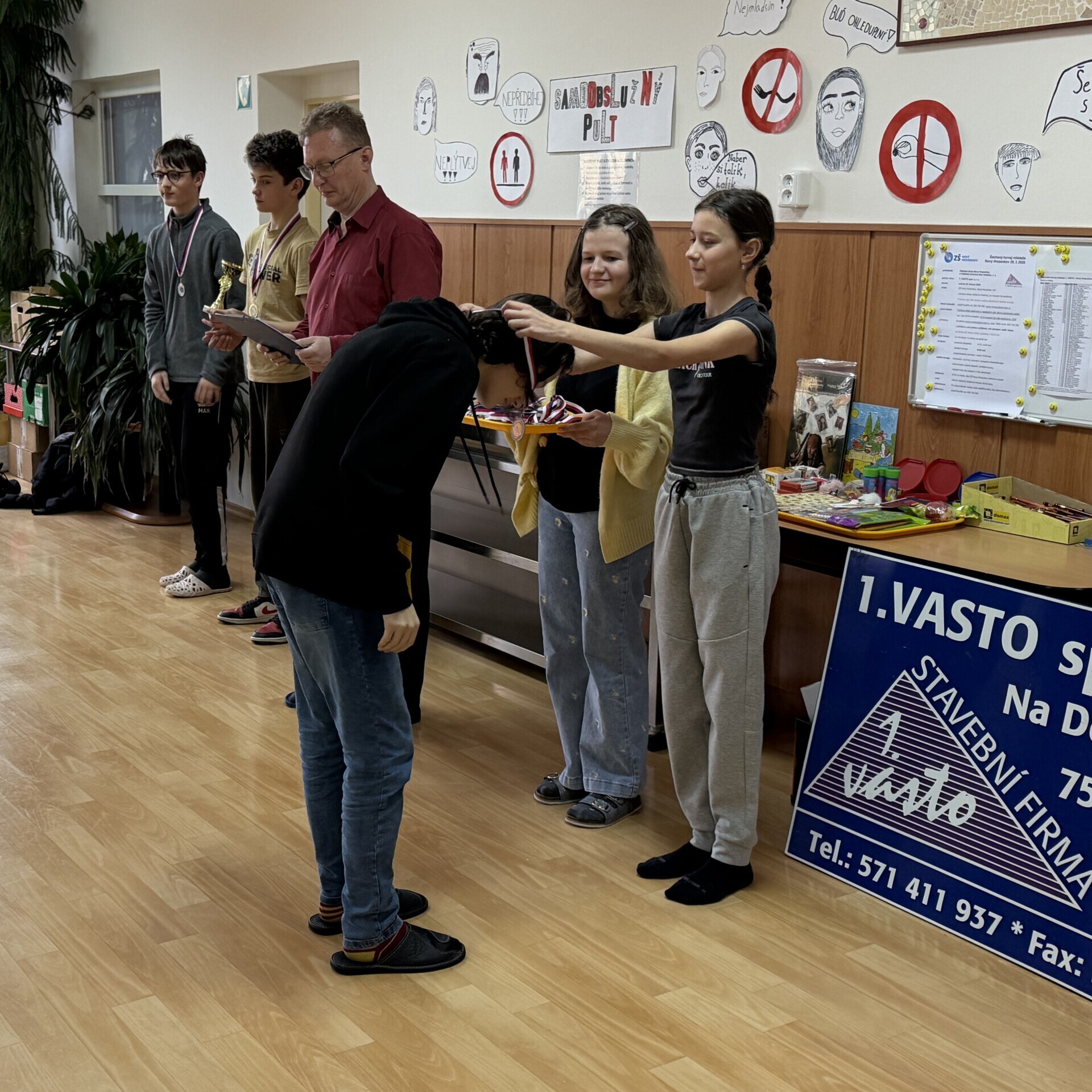 Ve škole jsme uspořádali sobotní šachový turnaj. V jídelně se sešlo 59 dívek a chlapců, aby se utkali na královském poli. Vítězem osmikolového klání se stal Jan Podzemný z Huslenek. Mezi šachisty z Karolinky, Hošťálkové, Ústí, Lužné, Francovy Lhoty, Bystřičky, ze Zubří, Vsetína a Slavičína se představilo 17 žáků a žákyň naší školy. Nejvýše se umístili Josef Šarman a Matouš Vrážel, kteří dokázali uhrát 4,5 bodu. V kategorii neregistrovaných šachistek si medaile odnesla naše děvčata z páté třídy, Stella Kopřivová, Alexandra Mazáčová a Žaneta Boháčová.